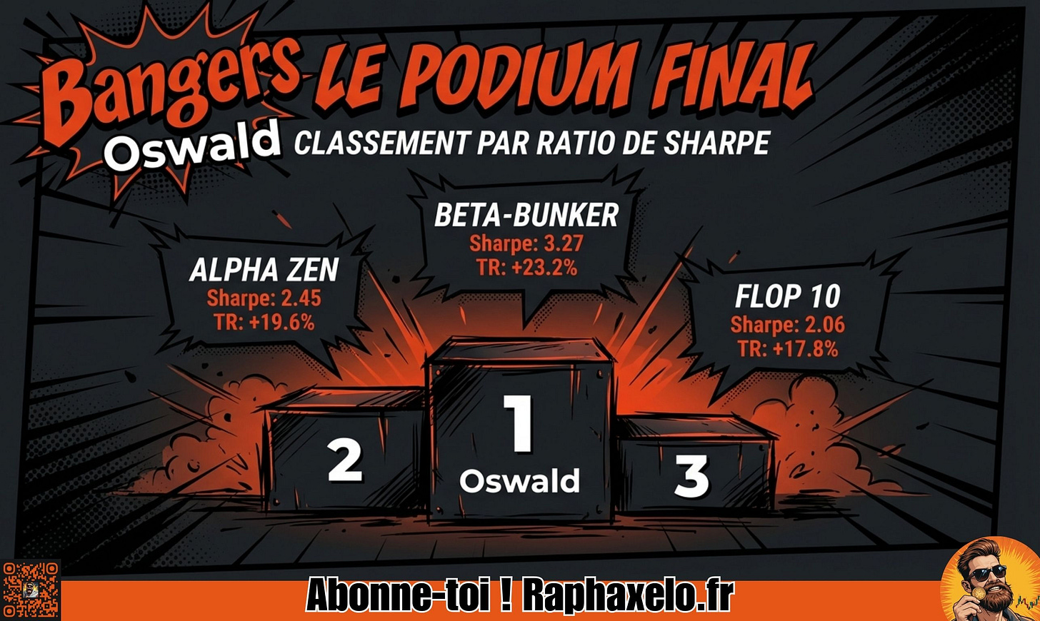 En moins de deux mois, le β-BUNKER ANTI-KRACH caracole en tête avec +23,18%, suivi de près par ALPH ZEN à +19,59%. Ce qui pique les yeux, c'est la troisième marche du podium : le Flop10 Analystes à +17,79% - soit le portefeuille construit sur les actions que les analystes détestent le plus. Pendant ce temps, leur Top10 à eux saigne à -7,90%.