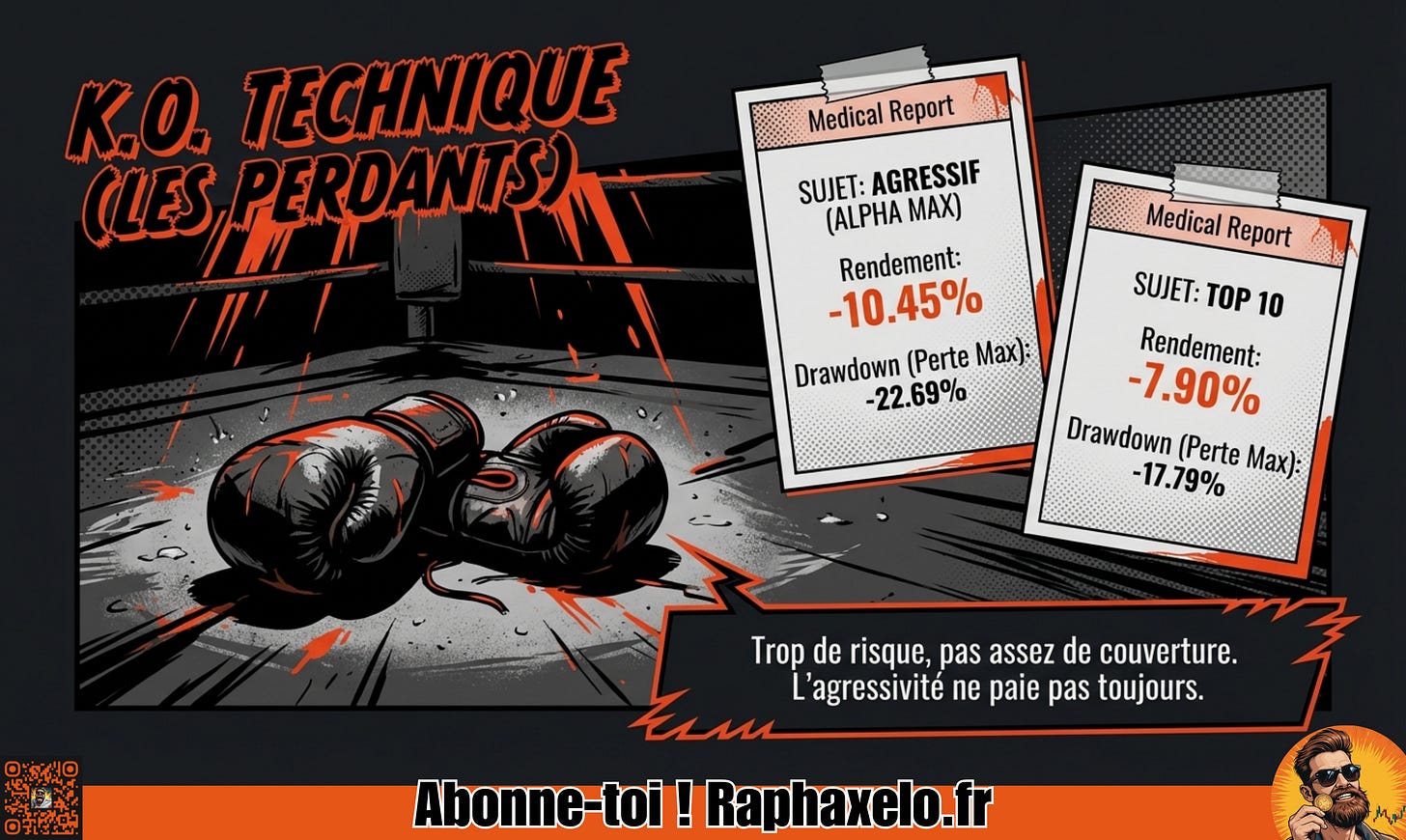 En moins de deux mois, les trois perdants ont un point commun : trop de levier ou trop de confiance dans le consensus. L’AGRESSIF Alpha Max encaisse -10,45% avec une volatilité à 36% - quand tu joues agressif et que le marché ne suit pas, la facture est salée.